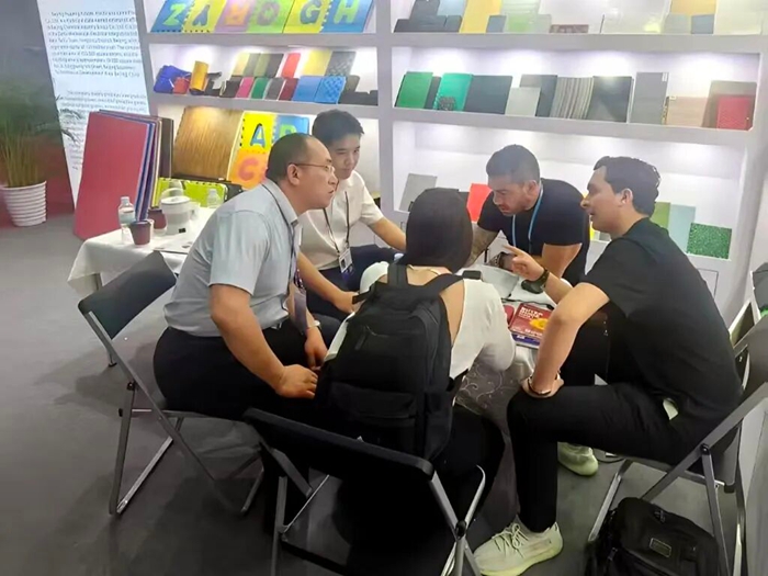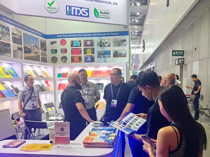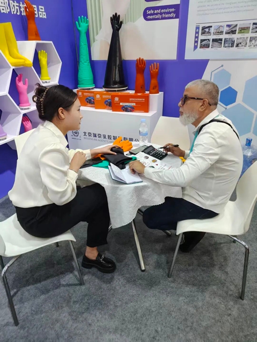 在本屆廣交會第一期,華騰橡塑與瑞京公司聯袂登場,其中華騰橡塑重點展示了公司創新研發的濕法混煉天然膠膠板產品;瑞京公司則帶來了“雪蓮”牌專業工業用手套系列產品,吸引了眾多國際客戶駐足交流,現場與部分客戶達成初步合作意向并計劃寄送樣品,為后續深入合作打下良好基礎。